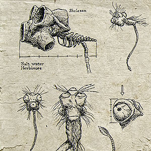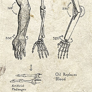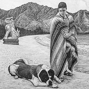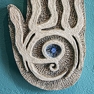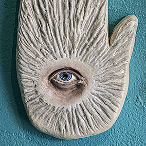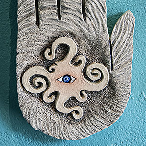 Items which don’t fit in the other categories: Ink and parchment page excerpts from the Compendium Praecognita, a collection of Hamsa Hand polymer clay wall sculptures, graphite drawings of Hawaiian St. Bernards on the beach and my popular smiley face skull.